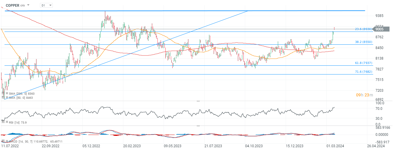 COPPER futures break above $9000 level, where we can see the 23.6 Fibo retracement of the upward wave from the summer of 2022. Source: xStation5