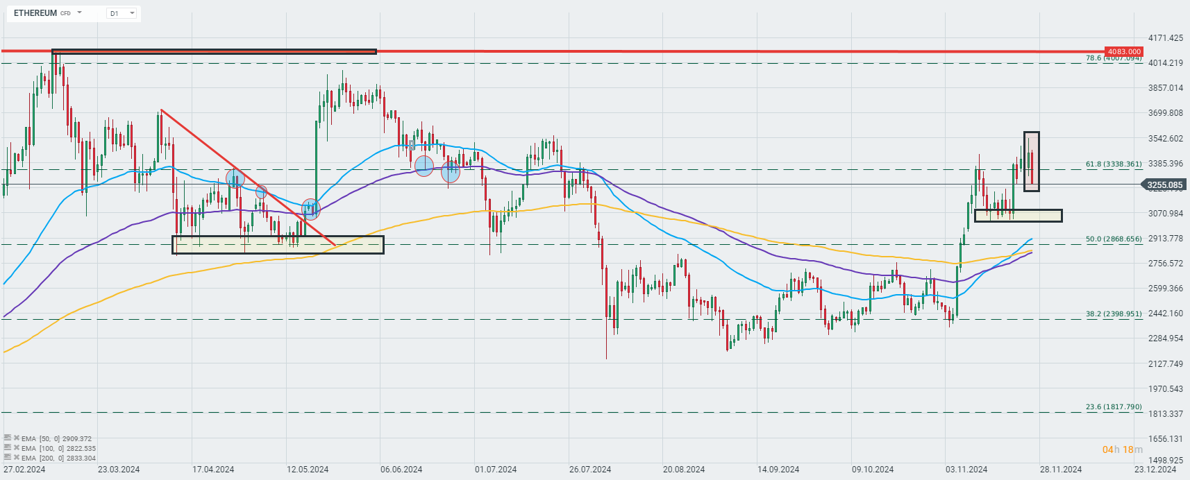 What are the causes of these declines? At the moment, it seems that it is mainly the effect of some investors closing profitable positions. Remember that in just 16 days (since the beginning of November), the price of BTC has jumped by almost 47%. A similar scale of increases was observed on Ethereum.