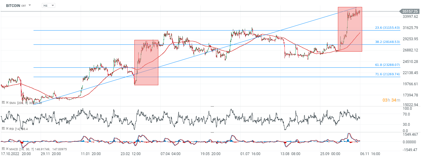 Looking at Bitcoin chart, we see that the last upward impulse was 1:1 equal to the bullish price reaction of March 2023 when the serious problems of the banking sector began. If the situation were to repeat itself,we could potentially see a move towards $37,000 (MACD had a 'bullish' cooldown) in the coming days but Bitcoin could still face significant resistance ahead of the $40,000 level and the 'temptation' to realize gains exists as an increasing proportion of short-term investors find themselves in profit creating potential 'ballast' that they will be willing to realize if sentiment were to reverse. Source: xStation5