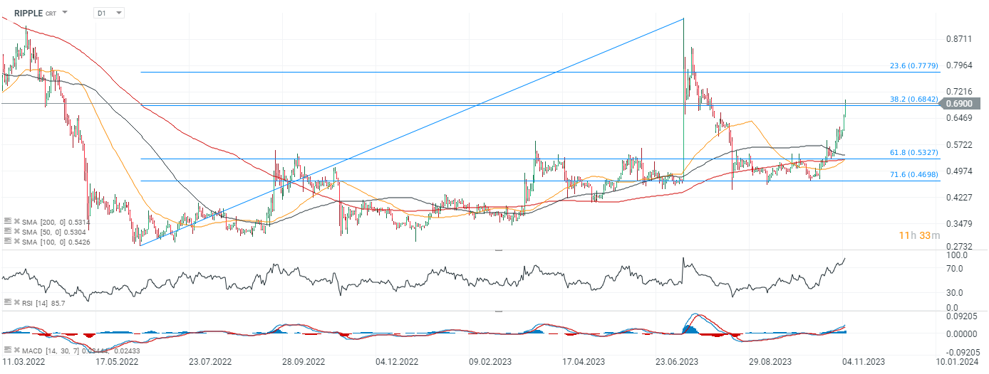 The price of Ripple has managed to break above the 38.2 Fibonacci retracement of the upward wave from the fall of 2022 at $0.68 - the price has been rising for days and fuel for the increases in recent days has been added by speculation around the XRP implementation on the X platform.  However, if there are no specifics on the matter in the coming days, the temptation to realize profits may herald a correction - the RSI on the D1. interval currently indicates extreme overbought levels at 85 points - close to the euphoria of June when the market saw the project's chances of winning against the SEC. On the other hand, the selection of Ripple to X before the fintech company settles its case against the SEC may be in question especially given that Musk's acquisition of Twitter itself is currently under investigation by US regulators. Source: xStation5