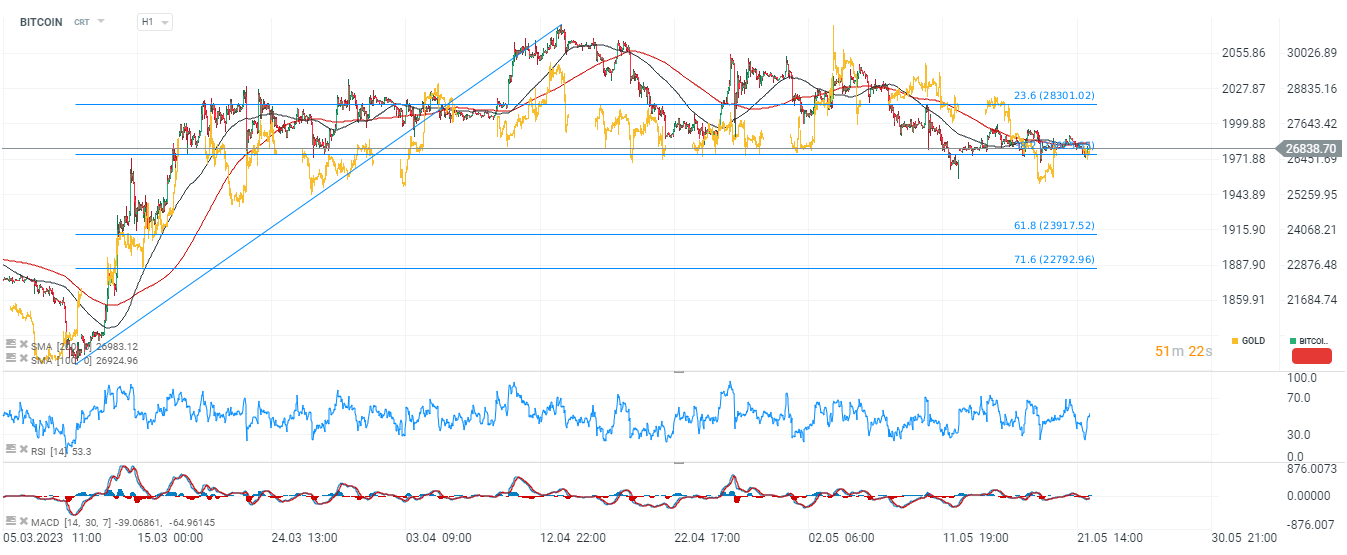 Bitcoin chart, H1 interval. The price has fallen below the SMA200 and SMA100 signaling progressive weakness in the major cryptocurrency. The primary support zone is the 38.2 Fibonacci retracement of the March 10 upward wave. A potential breakout below it could open the way to $24,000 where we see the 61.8 Fibonacci retracement. Since the US banking crisis, bitcoin has maintained a fairly intense correlation with gold prices (yellow chart). Source: xStation5
