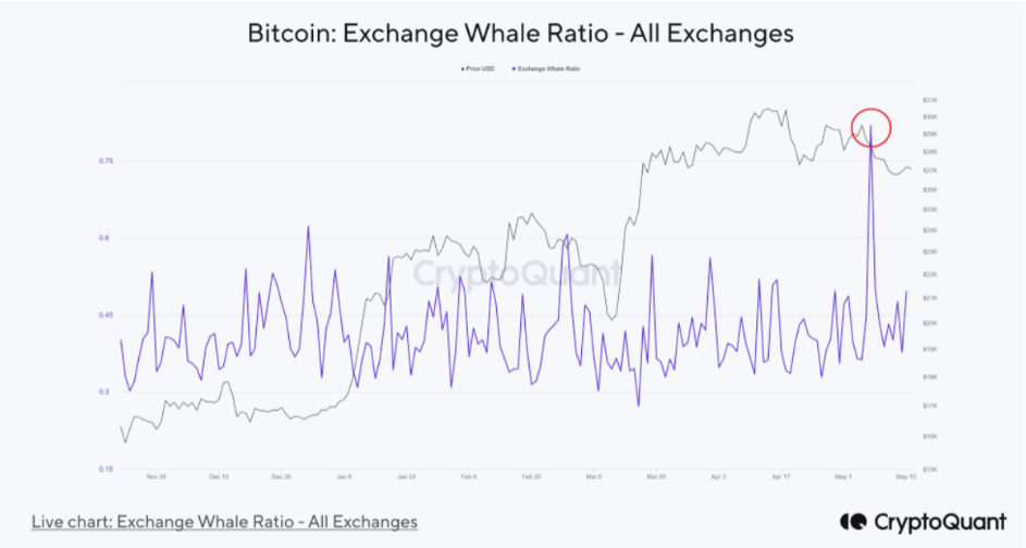 Data from CryptoQuant indicated that the impact of so-called whales on Bitcoin's price weakened in May, with a high at the beginning of the month. The Exchange Whale Ratio, tracks the ratio of the size of the ten largest transactions affecting an exchange relative to all transactions. It is he confirmed that whales have been placing BTC on exchanges recently - most strongly in early May, when the price settled around $30,000. According to.CryptoQuant, BTC transactions by whales on exchanges rose to high levels then (nearly 40% of transfers). Source: CryptoQuant