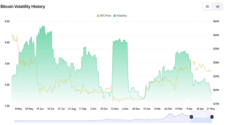 Bitcoin's volatility continues to fall, and the price is clearly having trouble breaking through $27,000. The decline continues from the beginning of May, when the price oscillated around $30,000. In this zone, long-term investors took advantage of the highest average gain of 34% this year. In addition, on-chain data showed that the supply at the beginning of May may have largely come from the side of the largest investors of the so-called "whales" (portfolios above 10,000 BTC). Historically, the price of the largest cryptocurrency tends to make a dynamic turnaround after a period of diminishing volatility - but it needs a volatility catalyst.