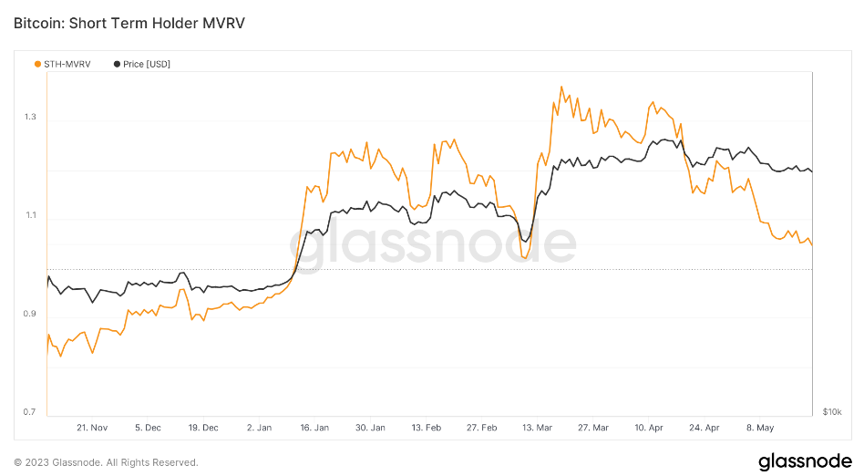 STH-MVRV measures the ratio of the average price paid for BTC by short-term investors (STH) to the realized price, i.e. the average historical price of BTC purchases by all investor groups. Currently, this onchain metric is heading for a 'reset,' meaning that disproportionately large STH gains are consistently erased. The recent drop in STH-MVRV may signal a deeper correction. Only the level of $24.4k would bring back the so-called breakeven level of 1.0. This zone often proved to be a support point when Bitcoin was in a bull market. Currently, the index is around 1.047. Source: Glassndoe