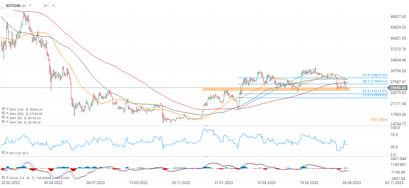 Looking at the chart of BITCOIN on the D1 interval, we can see that the price remains within an important price range - around $26,000. These are levels set by previous price reactions, including local peaks from the summer of 2022, the price peak from February, the lower range of the consolidation from May, the bottom of the sell-off from June and the range of the sideways movement after the cascading sell-off from mid-August. Looking at the significant Fibonacci retracements of the upward wave from April 2023 (the banking crisis, after the increases then returned to the narrative of Bitcoin as a 'safe haven' asset). We can see that the price between the 38.2 retracement ($27,000) and the 61.8 retracement ($24,000). All three key averages of the SMA200, 100 and 50 are above the price today, and momentum temporarily favors sellers. For the moment, a test of the area around $24,000 seems a more likely scenario. Source: xStation5