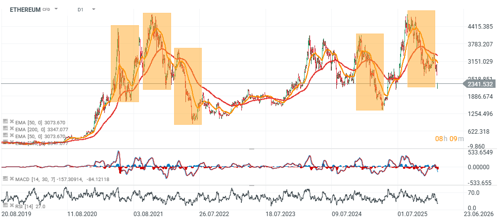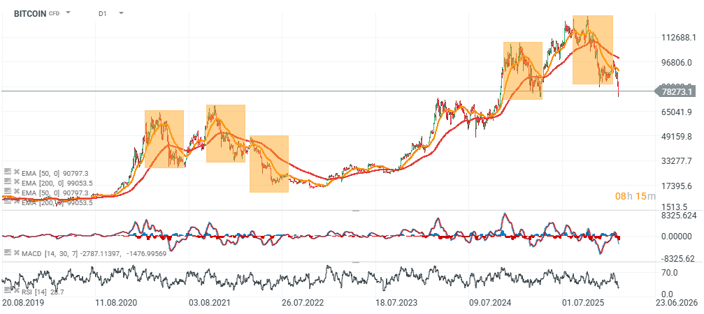 There is therefore no doubt that the current correction (40% from the peak at USD 126,000) can be described as a technical Bitcoin bear market. If history were to serve as a guide, Bitcoin could trade in the USD 50,000–60,000 range in the second half of the year. The biggest risk for the markets remains the situation around Strategy, which has accumulated hundreds of thousands of BTC in recent years (average price approx. USD 76,000 per BTC), as well as selling pressure from US spot ETFs, which for practically the first time since their launch in 2024 are currently showing an average loss of a few percent. As long as BTC is trading below USD 90,000, the advantage remains with sellers, and the four-year halving cycle seems to be “materializing” before our eyes, with a potential “bear-market bottom” in Q4 2026.