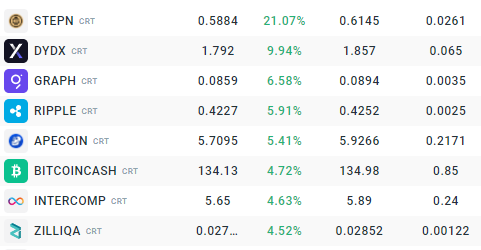 Smaller cryptocurrencies dominate today's gains. Of the larger projects, Ripple and Bitcoincash are gaining. Source: xStation5