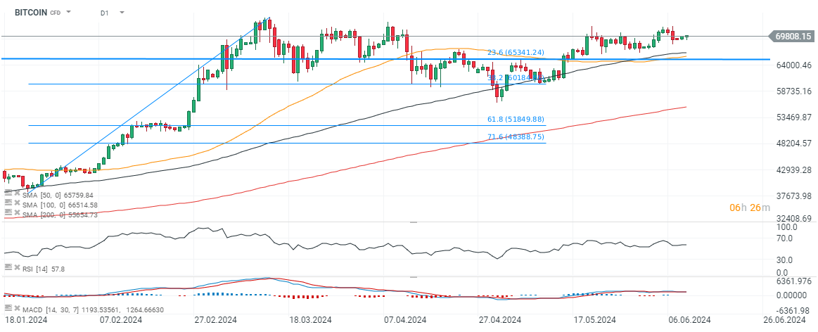 Looking at the daily chart of BTC, we see that a key short-term support level runs around $65,000. A drop below this level could suggest the potential bearish formation of a second lower peak. However, rising to $72.000 may suggest strong demand and re-testing ATH.