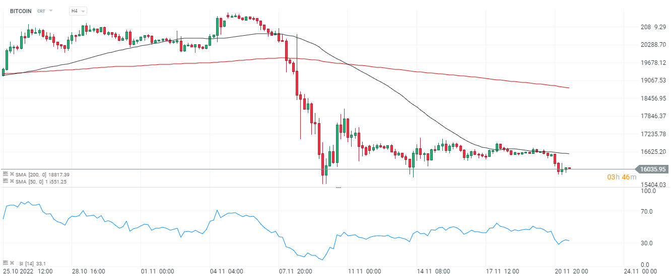 Bitcoin is trying to hold the key psychological level of $16,000 while most of the industry is rallying to deepen the sell-off of the major cryptocurrency. Ethereum is trading around $1120 erasing most of the gains between June and October. Other altcoins are also trading weakly. Cardano is approaching $0.3, and Polygon, which recently reported that it is collaborating with Meta Platforms on instagram NFTs, is retreating to the area of $0.8 erasing the euphoric increases of late October and early November. Powerful sell-offs were also experienced by Metaverse projects like Decentraland and Sandbox, these cryptocurrencies completely erased the huge surges initiated in 2021.