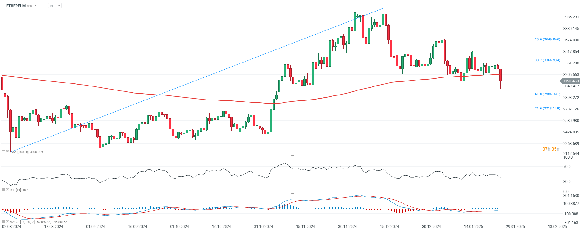 Ethereum today fell below a key support level, in the form of the EMA200 average (red line), at $3,000. The lack of strength to overcome $3200 could signal a more permanent reversal to a downtrend.