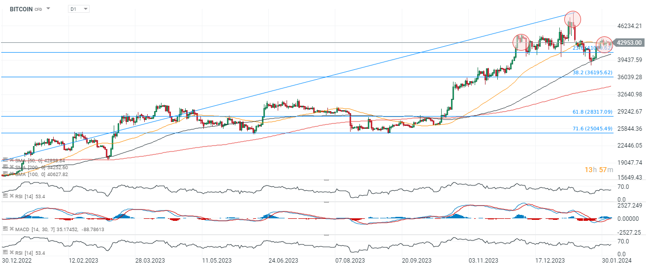 Looking at Bitcoin's chart, on the D1 interval we see a potentially bearish head-and-shoulders pattern where a drop below the 23.6 Fibonacci retracement ($41,000), of the upward wave from the fall of 2022, could mean a break below the neckline and drive the price even to the area of the SMA200 ($34,000red line), at the level of which there is currently an important on-chain level, i.e. the average purchase price of BTC by all, active investors (a level often tested during corrections, in previous upward cycles). In the opposite situation, important levels for Bitcoin are around $48,000 (recent peaks) and $50,000 (psychological resistance zone).