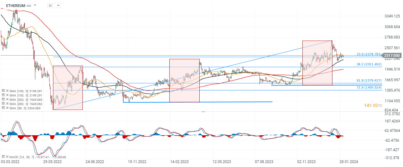 The recent magnitude of the gains on Ethereum may be a harbinger of a broader continuation or even a prolonged period of weakness. Sentiment, however, will depend heavily on the next signals for the Ethereum ETF and the sentiment in the Bitcoin market itself. A scenario seems possible in which ETH's gains will accelerate only in the final phase of the closing ETF (ETC) fund 'approval' window at the SEC, closer to the summer period. On the other hand, a potential rally in Bitcoin before halving (roughly mid-April 2024) could push the price up, even into the $3,000 area.