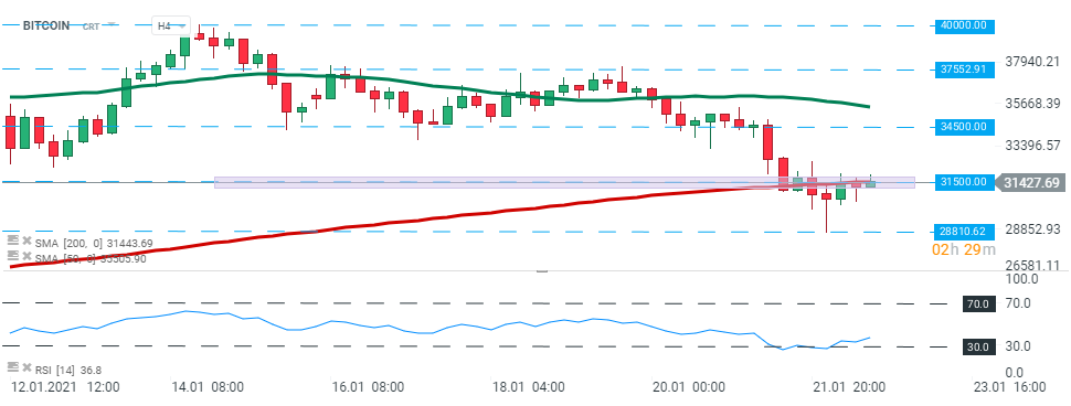 From a technical point of view, Bitcoin bounced off the $28,810 support level yesterday and currently the price is testing major resistance at $31,500 which coincides with 200 SMA ( red line). If buyers will manage to break above it, the upward move may be resumed. Also RSI is rebounding from the oversold area which is also a bullish sign. Next potential target for bulls is located at $34,500 level. However if sellers manage to regain control, then another doward impulse could be launched.