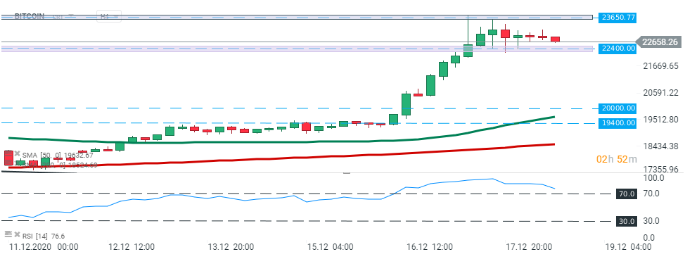 Bitcoin takes a breather from the two-day rally but still remains above the major $23,000 level. RSI hints at a consolidation, perhaps between $22,400 and the new yearly high at $23,650. However if break higher occurs buyers will likely shift their focus on higher levels towards $24,000 and $25,000, respectively. Source: xStation5