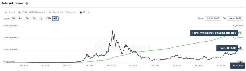 The total number of addresses with a balance surpassed 50 million for the first time in history. It is an optimistic signal as it implies a more robust and growing user base. Source: Intotheblock
