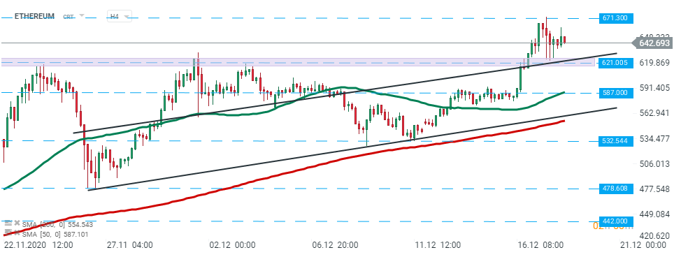 Ethereum broke above the $621.00 level on Wednesday and reached the highest levels this year at $671.30. However buyers failed to uphold momentum and price pulled back, however the aforementioned level of $621.00 turned out to be strong support. If buyers manage to break above this year's highs, then another upward impulse toward resistance at $780.00 could be launched. Source: xStation5