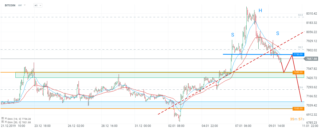 Bitcoin started to appreciate amid Middle East tensions and climbed to the $8400 area for the first time since November 2019. The upward move was halted at the 50% retracement level of the downward move started at the end of October. As are situation began to calm, the most popular cryptocurrency started to lose ground and slid below the psychological $8000 mark. In turn, a head and shoulders pattern surfaced on the Bitcoin chart with neckline at around $7750. Should the coin realize the range of the pattern in a textbook manner, declines could reach $7000.