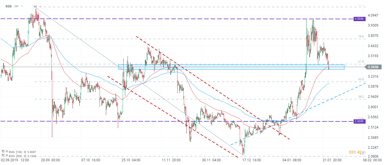 EOS also took a dive amid Bitcoin depreciation. The altcoin has lost around 15% in value since the beginning of a week. Price is attempting to break below support ranging around 61.8% Fibo level at press time. Should it break lower, 200-period moving average could be the next target for sellers. The final support level is localized at 2.60 USD. The nearest resistance can be found at the recent peak of 4.05 USD. However, as the altcoin is showing clear downtrend structure with lower lows and lower highs, looking for a long position could be a risky play.