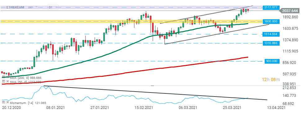 Ethereum, the world’s second-most popular cryptocurrency, jumped to a new record high at $2117 last week which coincides with the upper limit of the ascending channel. However buyers failed to sustain the upward move and price pulled back. Also a bearish divergence appeared on the Momentum indicator, which might indicate that sellers are gaining control on the market. The nearest support lies at $1800 level. On the other hand, if buyers will manage to regain control and break above the aforementioned resistance zone, then the way towards the new all-time high will be left open. Source: xStation5