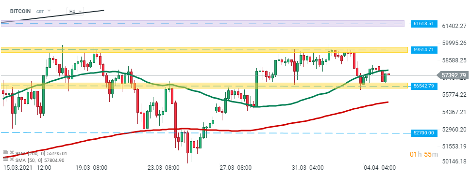Bitcoin has been trading in a local sideways move recently. Coin failed to break above the resistance at $59,514 and price pulled back to the support at $56,542. Should a break below occur, then downward move may accelerate towards next support at $52,700. On the other hand, if buyers will manage to halt declines here, then another upwards impulse towards the upper limit of the range or even all time high at $61,618could be launched. Source: xStation5