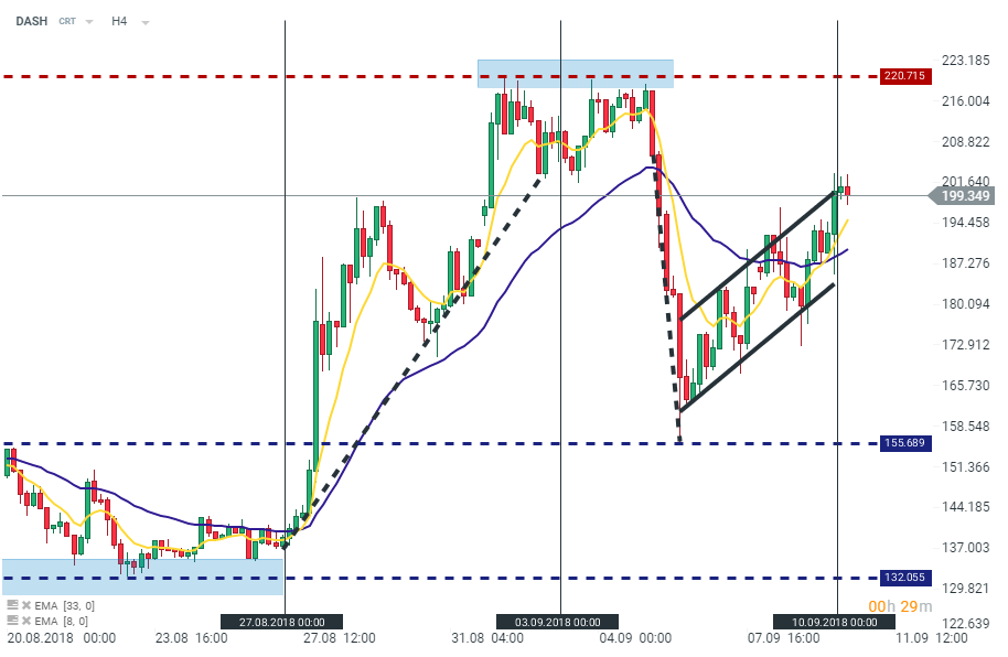 Over the past 24 hours DASH moved significantly higher to around $200. On Monday morning, the digital currency is fluctuating in the vicinity of the mentioned level and clearly above the 8- and 33-period moving averages on the H4 interval (the yellow and purple lines on the chart). Source: xStation5