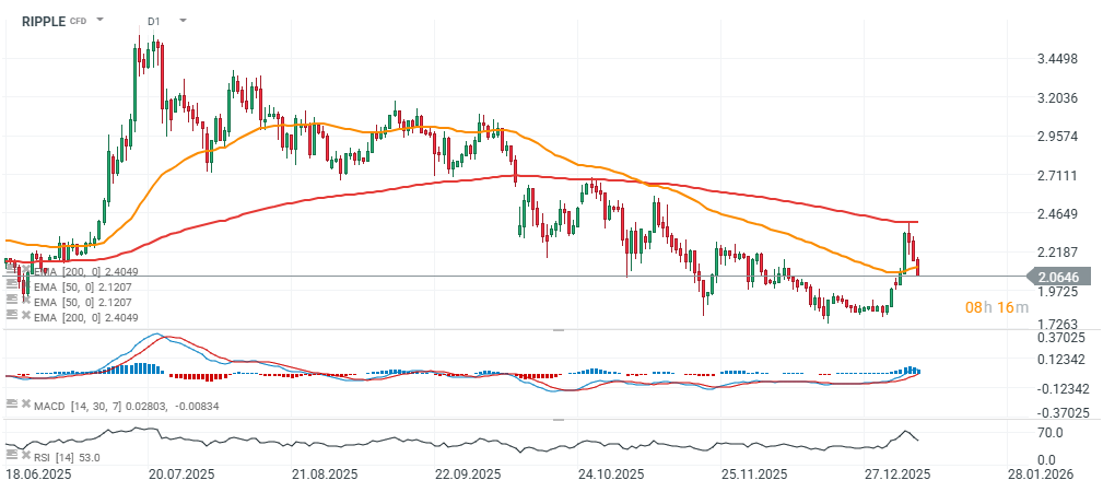 XRP is down sharply today and has almost completely erased its New Year gains, sliding below the EMA200 (red line). This comes despite an agreement with Amazon Web Services (AWS), which, through its generative AI platform Amazon Bedrock, has taken on the task of improving the XRP Ledger by monitoring and analyzing the blockchain.