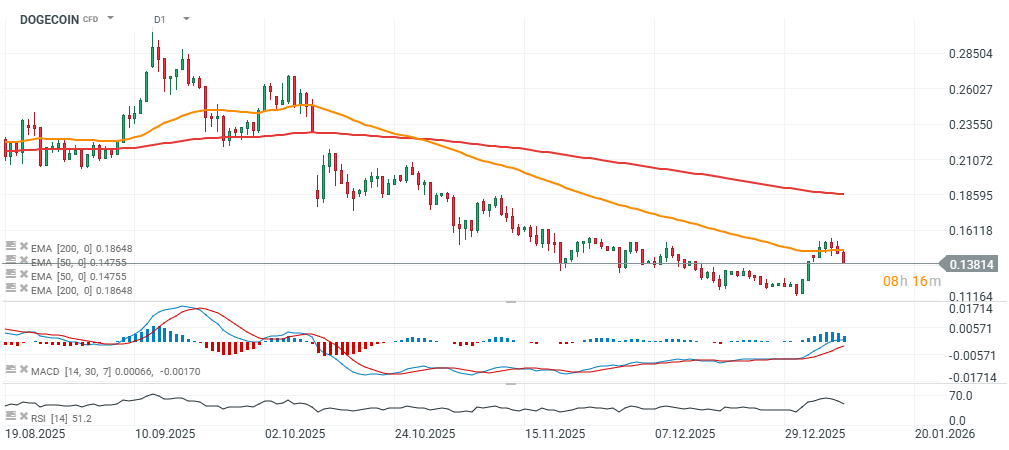 Similar to XRP, Dogecoin has also retreated to USD 0.138, wiping out gains from recent days. The price has once again slipped below the 50-period moving average and has failed to remain above it for more than the first few days of January.