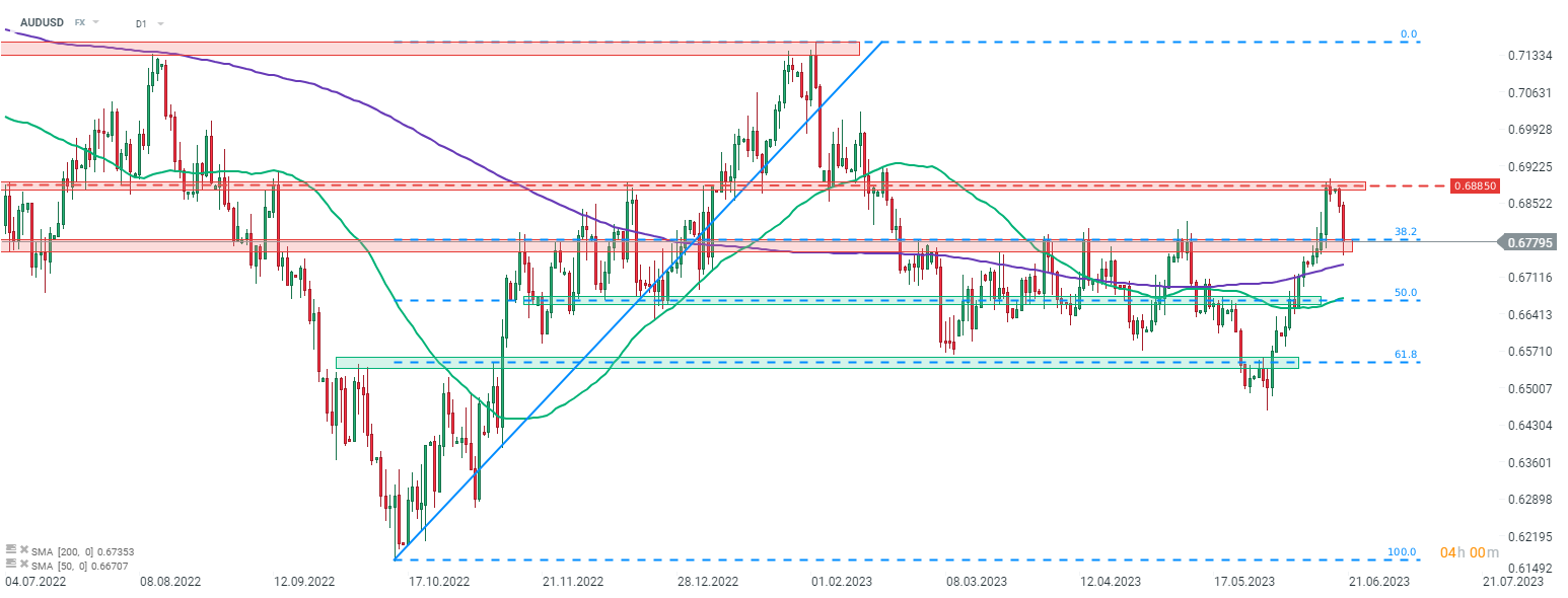 AUDUSD took a big hit today as RBA minutes turned out to be dovish and US housing market data beat expectations by a huge margin. The pair deepens pullback launched after a failed attempt at breaking above the 0.6885 resistance zone and tests 38.2% retracement today. Source: xStation5
