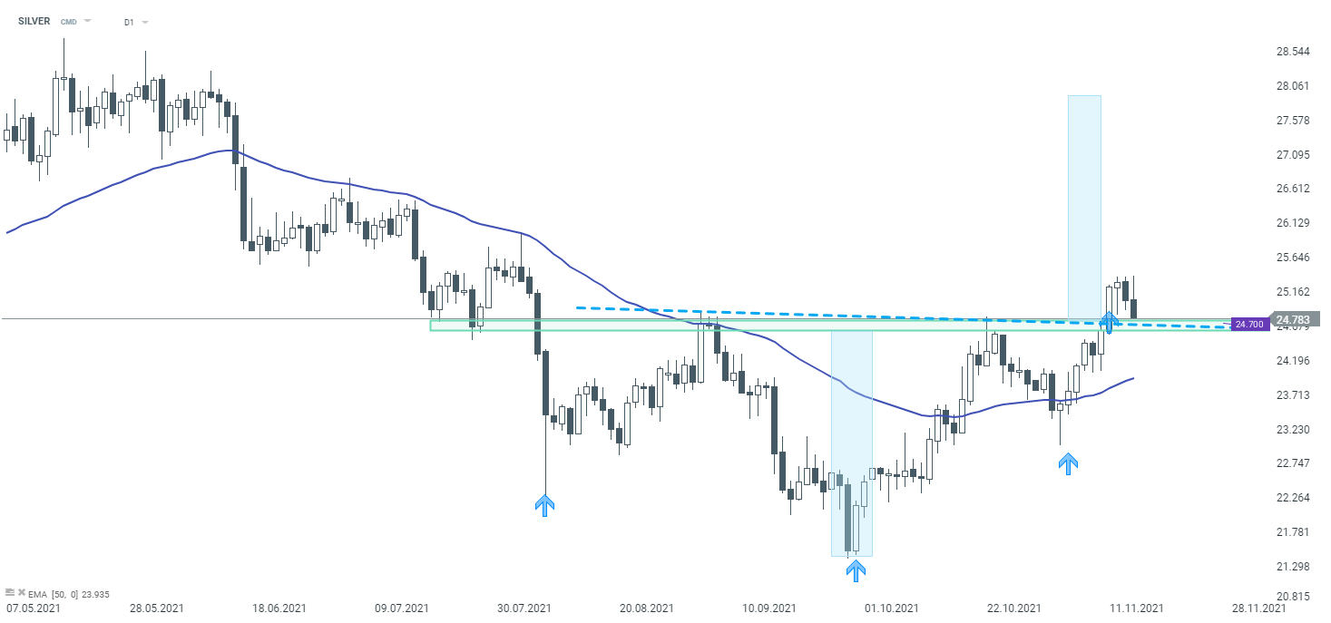 SILVER - last week, the price of silver broke above the key resistance zone at $ 24.7, which, according to the classic technical analysis, could indicate a trend reversal. The aforementioned zone coincides with the neck line of the inverted head and shoulders formation. Currently we can observe a strong pullback, but if buyers manage to halt declines at $ 24.7 area, then another upward impulse may be launched. On the other hand, should the break below occur, downward move may accelerate. Source: xStation5