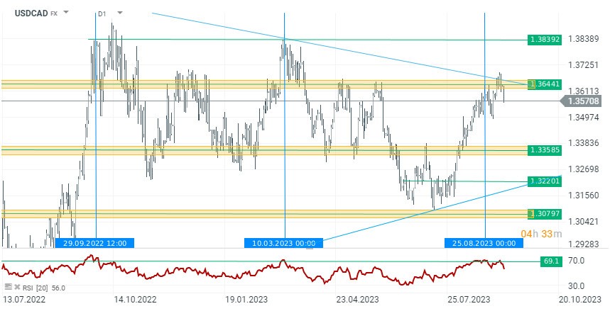 The Canadian dollar is strengthening against the dollar. Stronger labor market data in Canada and increasing oil market prices support CAD, additionally today's USD weakness contributes to USDCAD declines from the level of the key resistance zone, source xStation 5