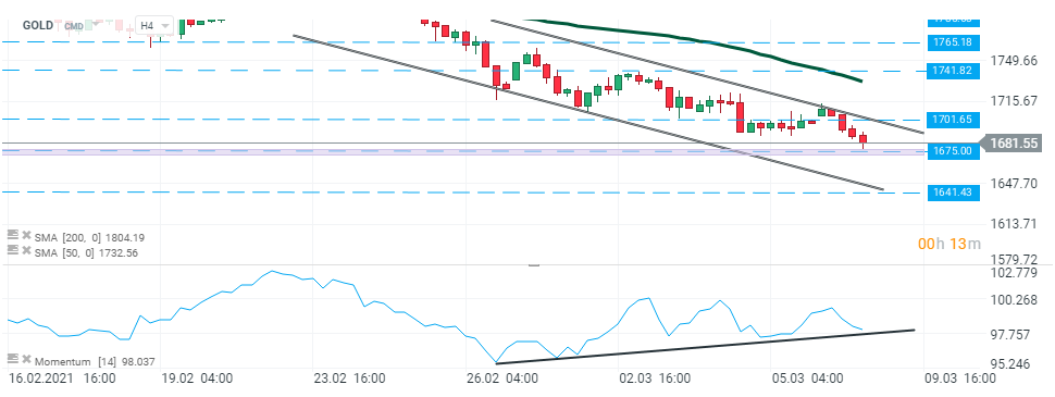 Gold price bounced off the upper limit of the descending channel during today’s session and is approaching strong support at $1975.00/oz. Should break below occur, downward move may accelerate towards next support at $1641,43/oz. However bullish divergence appeared on the Momentum indicator, which might indicate that sellers are slowly losing control on the market. Source: xStation5