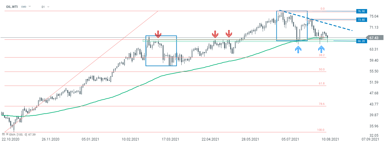 OIL.WTI started the week lower. The price tested a key support (area near the $66.20 mark seen on the chart above). The price rebounded from daily lows and is currently sitting at 100-day EMA (WTI is still down by roughly 1.50% on the day). Source: xStation5