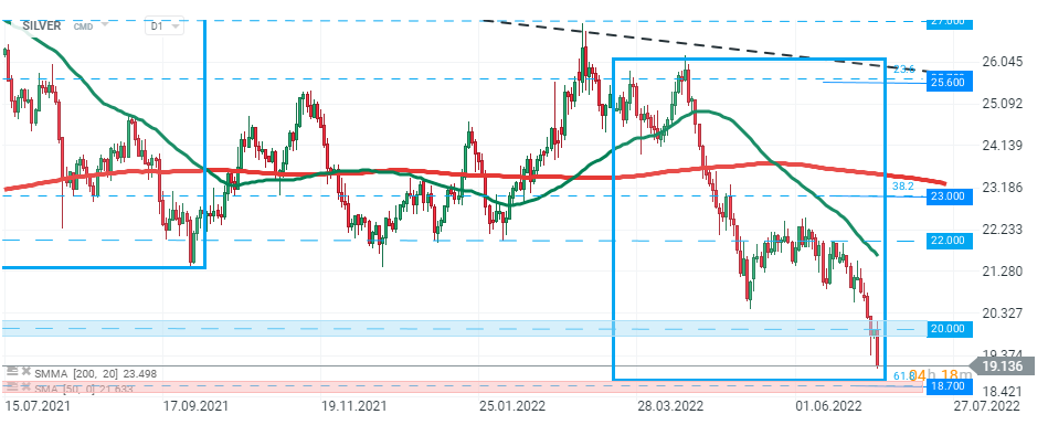 Silver fell over 4.0% during today's session and is approaching major support at $18.70, which is marked with lower limit of the 1:1 structure and 61.8% Fibonacci retracement of the upward wave started in March 2020. Source: xStation5