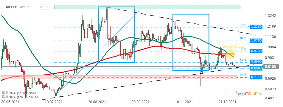Ripple is trading under pressure this week and price returned to the major support zone around $0.80 which coincides with long-term upward trendline and lower limit of the 1:1 structure. Also the medium-term 50-day SMA (green line) crossed under the log-term 200-day SMA (red line). This has formed a bearish ‘death cross’. Should break lower occur, downward move may accelerate towards next resistance at 0.7115 which is marked with 78.6% Fibonacci retracement of the last upward wave. On the other hand, if buyers manage to regain control, then another upward impulse toward 0.8660 may be launched. Source: xStation5