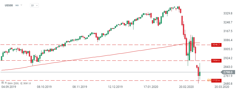 S&P500 (US500) plummeted yesterday and price tested the support level at 2722 pts. Currently we can observe a rebound from this level as it managed to halt downward move. The next resistance level is located at 2904.6 pts. Source:xStation5
