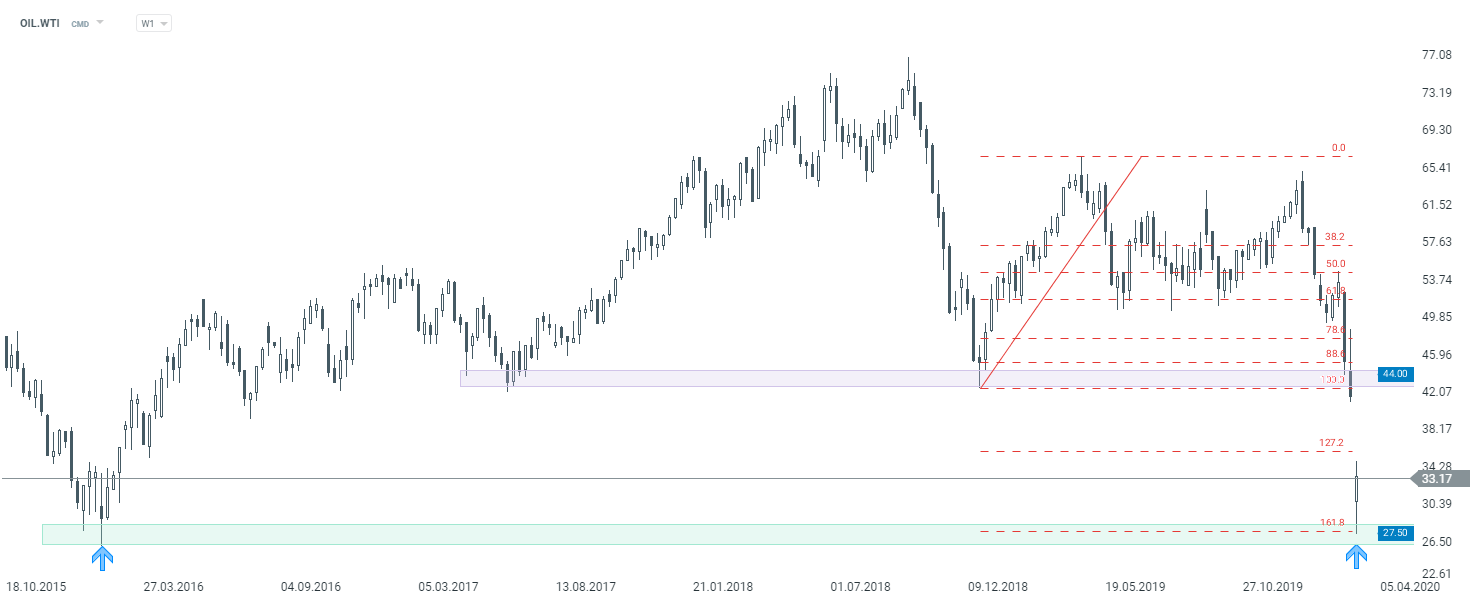 Oil price (OIL.WTI) has reached the 161% Fibo level ($27.50), which should act as short-term support. At present fundamental factors play the major role, in particular further news regarding the escalation of the trade conflict between Russia and Saudi Arabia.