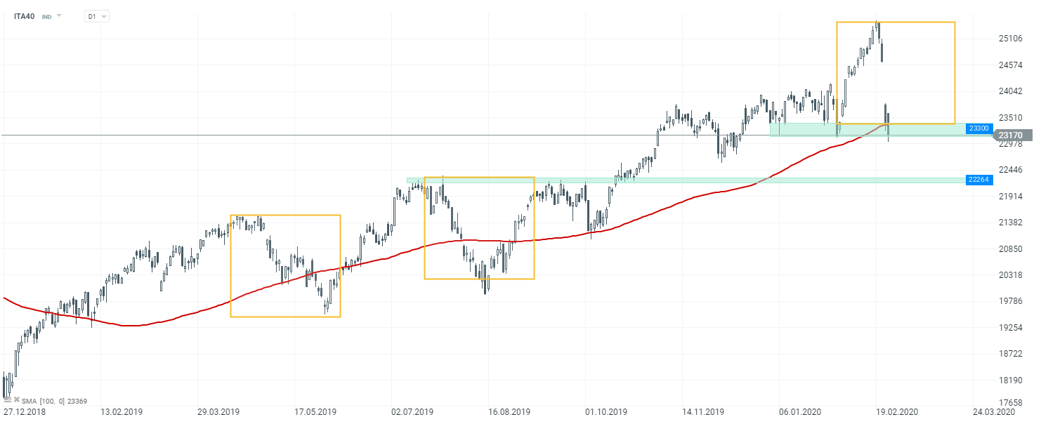 ITA40 dropped today breaking below crucial 23 300 support level. Further declines are highly possible as the next key support lies at 22 264 points. Source: xStation5