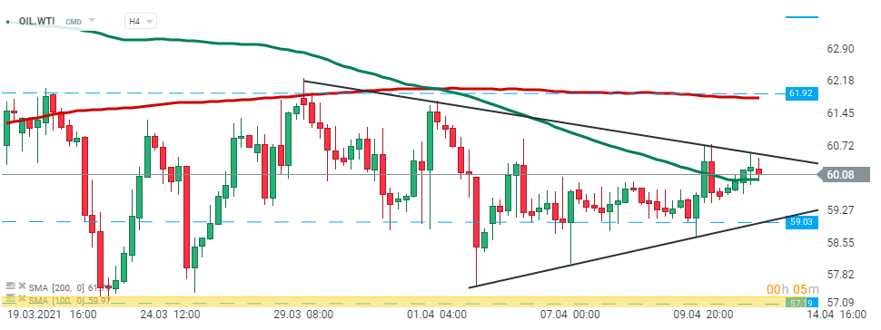 WTI crude (OIL.WTI) failed to break above the upper limit of the triangle formation and pulled back slightly. Should downbeat moods prevail, support at $59.03 may come into play. On the other hand, if buyers will manage to finally break higher, then upward impulse could be extended towards resistance at $61.92. Source: xStation5