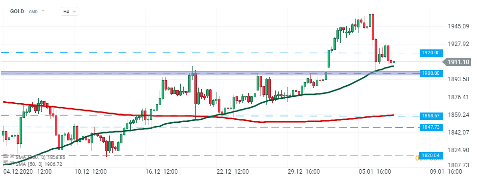 GOLD – price broke below $1920 level and is currently testing 50 SMA (green line) which coincides with major support at $1900. Should a break lower occur, downward move may accelerate. Next major support lies at $1858 and is additionally supported by 200 SMA (red line). Source: xStation5