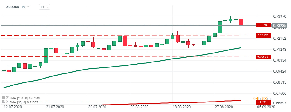US indices are trading higher with both S&P 500 and Nasdaq hit a fresh record highs as investors digest poor ADP report which showed that employment growth in the US slowed sharply. However, it seems that market was in "good news is good news and bad news is good news" mode again, as disappointing data raised hopes of more stimulus from FED. Governor Lael Brainard said yesterday that Federal Reserve will have to take additional actions in order to meet its - now revised - target for inflation. Meanwhile, Treasury Secretary Steven Mnuchin resumed talks with the House Speaker Pelosi regarding coronavirus stimulus package after previous negotiations between both sides broke up almost a month ago. Also, the Centers for Disease Control and Prevention will invoke its authority to halt evictions through the end of the year. During today's session Tesla (TSLA.US) stock fell 10%, while Apple (AAPL.US) shares dropped almost 3% taking a pause from the strong rally that followed their recent stock splits.