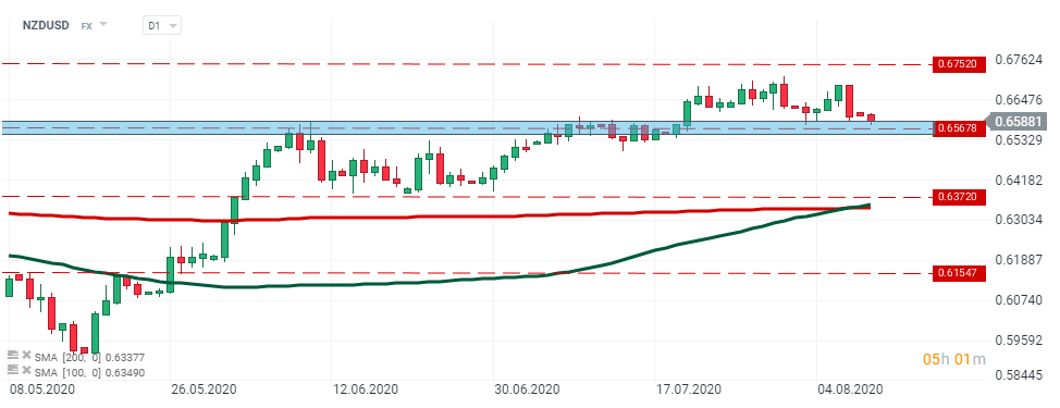 NZDUSD - currency pair is approaching major support at 0.6567. If sellers manage to break below it, an downward impulse towards 0.6372 could be launched. However if buyers manage to halt declines here, an upward move into 0.6752 is possible. Source: xStation5