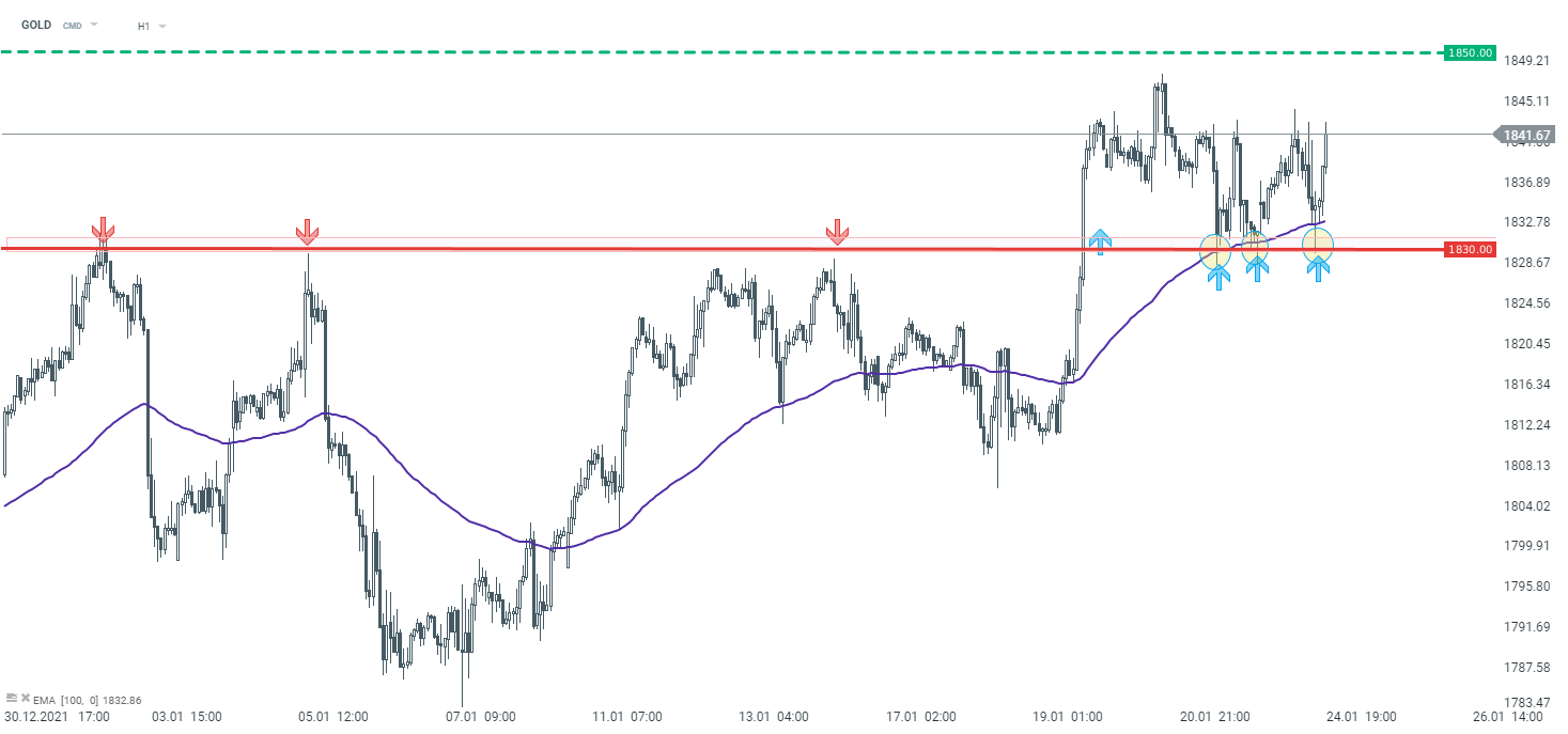 Gold prices remain in an uptrend. The $ 1,830 zone successfully held back the sell-off early this week. If current sentiment prevails, the bullish move may accelerate towards the recent high around $1850. Source: xStation5