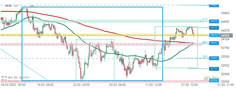 US30 pulled back after failed attempt of breaking above local resistance at 34725 pts which is marked with upper limit of the 1:1 structure. Currently index is testing local support at 34375 pts, should break lower occur, next support at 3400 pts may be at risk. Source: xStation5