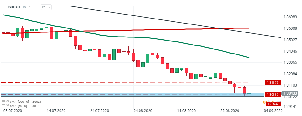 USDCAD - during today's session currency pair dropped to its lowest level since January 7 at 1.2996. Should downbeat moods prevail, the low from the end of December at 1.2953 may come into play. Source: xStation5