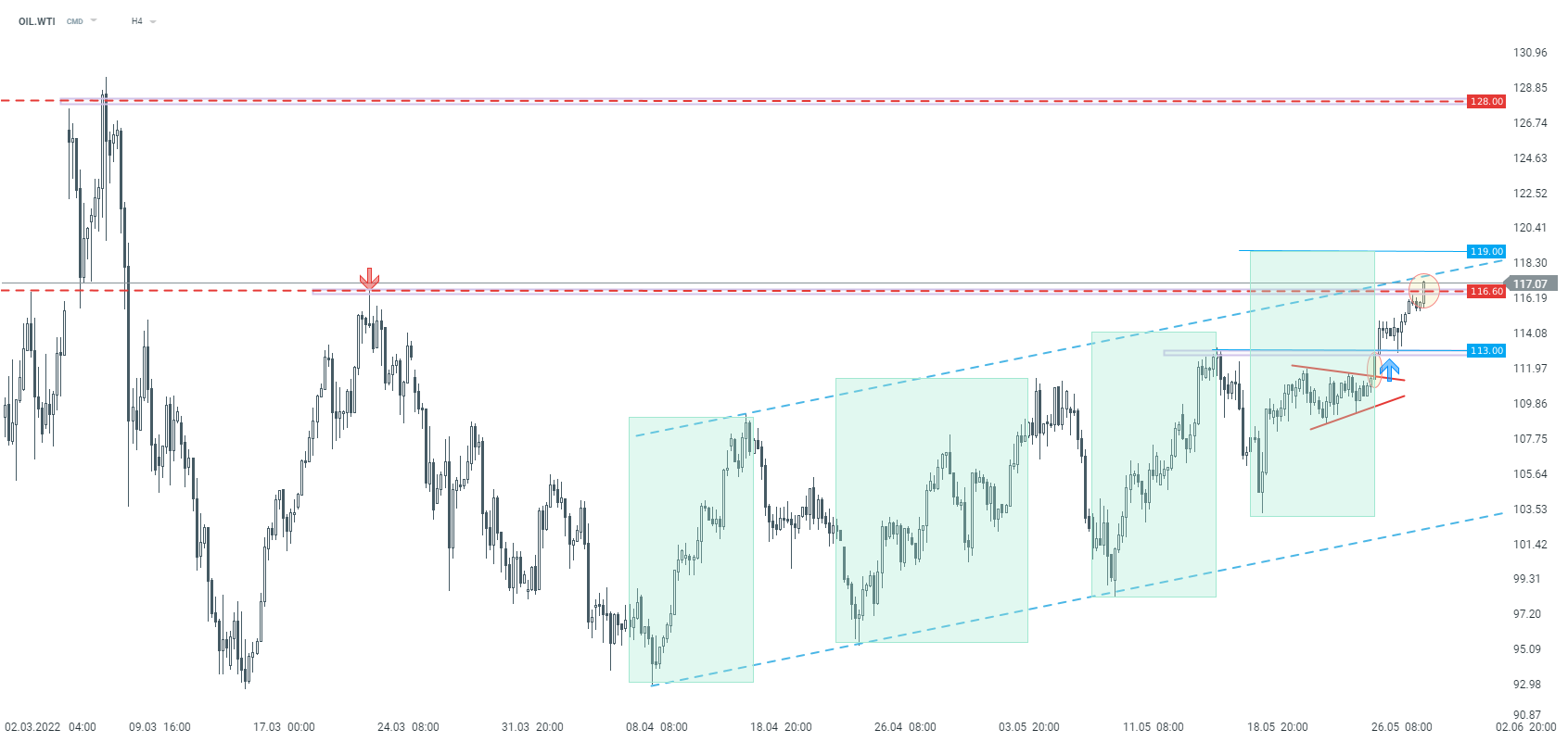 OIL.WTI quotations managed to cross the resistance zone at the level of $116.60, which stems from the peaks of March this year. If the upper limit of the wide growth channel is also broken, the growths can reach the level of $119.00, where the equality of the growth sections is located (the last 3 impulses marked with rectangles were of similar range). Source: xStation5
