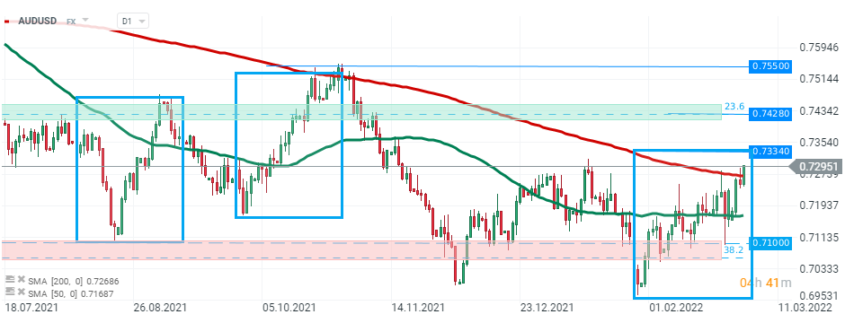 AUDUSD pair broke above 200 SMA (red line) as stronger-than-expected Q4 economic growth lifted sentiment. Aussie is also supported by rising commodity prices given Australia’s status as a net energy exporter and a producer of basic materials. Pair is currently heading towards local resistance at 0.7334 marked with the upper limit of the 1:1 structure. Source: xStation5