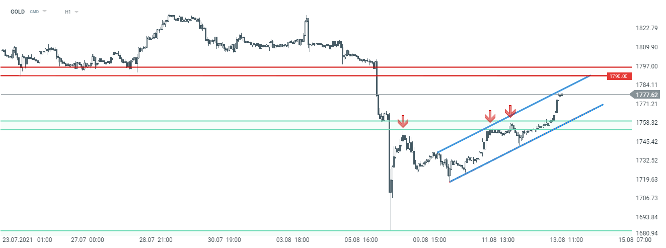 Taking a look at H1 interval, gold prices continue to move in a short-term upward channel. However, bulls were not able to smash through the upper limit of the pattern today. The next important resistance (apart from the mentioned upper limit of the pattern) may be found near $1,790 - $1,795 an ounce (local lows from July). Source: xStation5