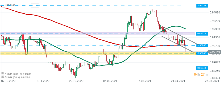 USDCHF broke below major support 0.9080 and lower limit of the descending channel. Currently the pair is approaching psychological support at 0.9000. In case of a break lower, downward move may gain further momentum and reach support at 0.8854. Source: xStation5