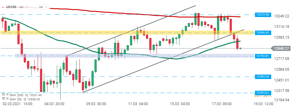 US100 fell more than 2.5% as a spike in US bond yields put pressure on tech stocks. Early in the session index broke below an important support zone which consists of the lower limit of the ascending channel and 13,046 pts level. Later sellers managed to break below 50 SMA (green line) which opened the way towards next support at 12,755 pts. Only, breaking above the aforementioned 13,046 pts level will invalidate the bearish scenario. Source: xStation5