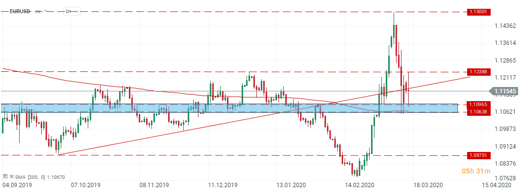 Right after the opening US indices plunged more than 9% extending previous losses. Trading was halted for 15 minutes as the sharp sell-off on the S&P 500 triggered a so-called circuit breaker. This situation has already taken place for the third time in the last few days. Later afternoon stocks tried to erase some losses and at end of the day DAX finished 5.3% lower, CAC40 dropped 5.9%, FTSE lost 4.7%. US indices are also trading in red. Dow Jones fell 9%, S&P500 is trading 8.05% lower , NASDAQ weaken 8.06%.